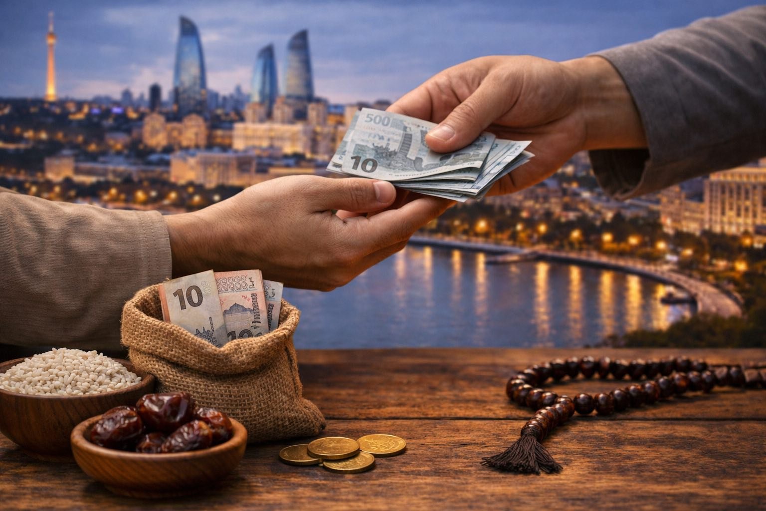 The amount is calculated based on the value of staple food products. In classical practice, fitr zakat was often given in food such as wheat, barley, rice or dates. Today in Azerbaijan, it is commonly converted into cash, which many believers consider more practical because it allows the recipient to decide what they need most.